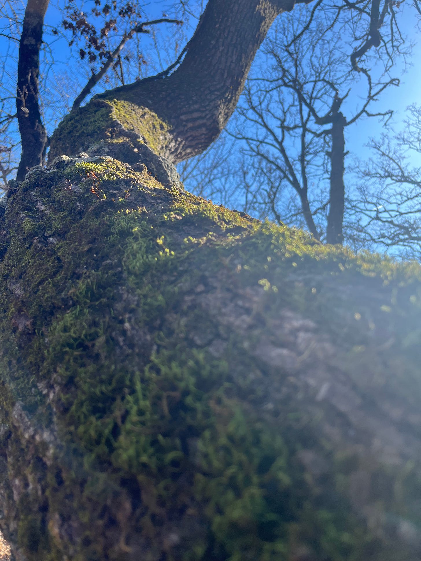 Up close, the trunk is covered in moss—thick, living, impossible to ignore once you see it.